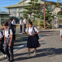 浅井4校あいさつ運動の2日目は、浅井中小学校の写真を掲示します。昨夜は大雨でしたが、朝には降り止みました。浅井中小学校東門は、浅井中学校西門に面しており、にぎやかな登校風景となります。