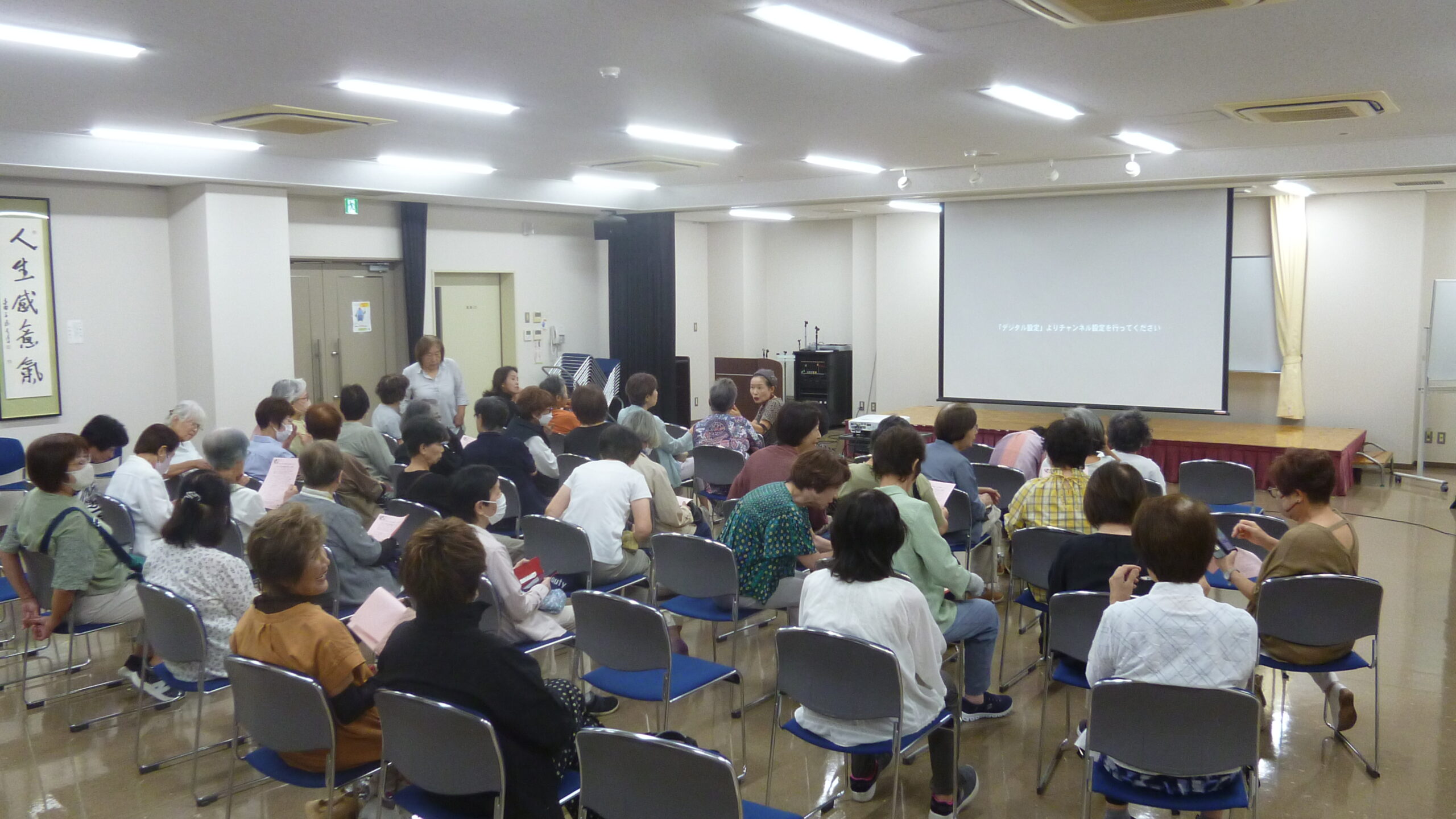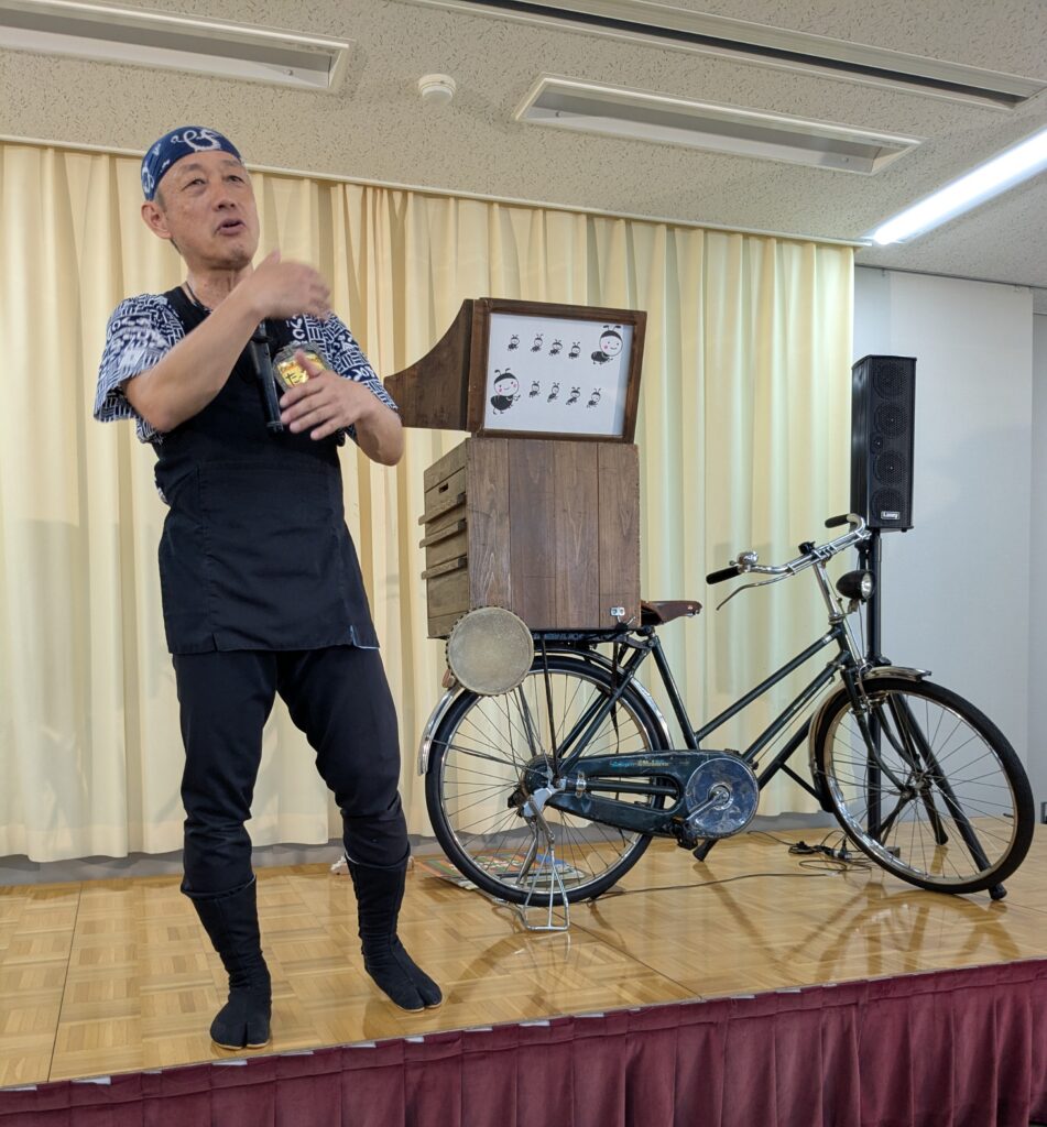 9月11日(木)9時30分から女性学級2日目の「なつかしいね あっぱれ本舗の紙芝居」が開催されました。昔の懐かしい形の自転車に紙芝居BOXを付け、絵をめくりながら、身振り手振りをまじえ、時には会場内を駆け回る紙芝居に会場が一体となり話の中に引き込まれていきました。後半では車座になり、ゲームやおしゃべりを楽しみました。帰りに幸ウンの品をいただいて終わっていきました。
