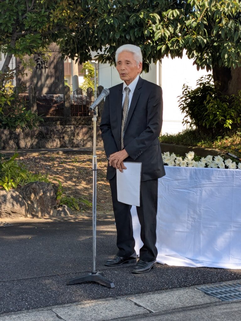 戦後80年を迎え、今年も浅井町慰霊碑前で9月27日(土)午前10時から戦没者戦災死没者合同追悼式が執り行われました。 ご遺族8名、来賓9名及び町会長会代表者9名、計26名の出席で、式典は、粟野和利連区長、浅井俊彦市議会議員の追悼の辞に始まり、続いて参列者全員の献花、最後に小島基弘遺族会長の謝辞と、厳かのなか滞りなく進行し、閉式しました。