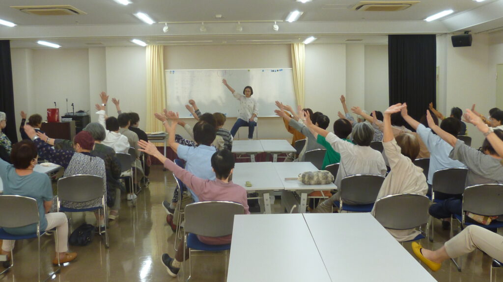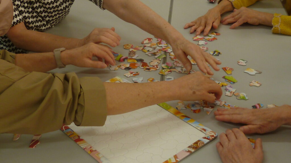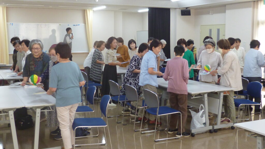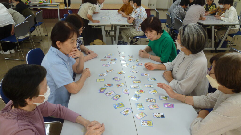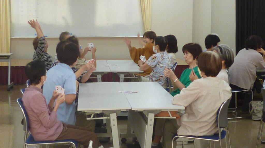 いつものような座学ではなく5~6名のグループに分かれ、まず軽く手足を使い頭と体をほぐすと、グループごとでうちわを使って紙風船のリレーに挑戦、その後は座って「かるた取り」「トランプ」「ジグソーパズル」をしました。時々歓声も上がり皆さん童心に返ってゲームを楽しんでいました。
