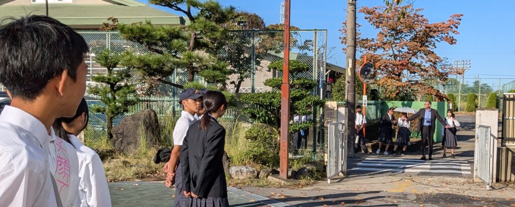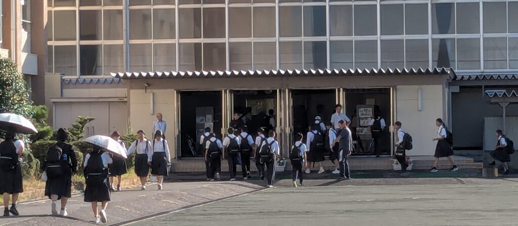浅井4校あいさつ運動の4日目は、浅井中学校です。快晴の朝となりました。中学生になると集団登校でなくなります。2㎞以上であれば自転車通学も可能です。元気一杯の大声からぼそぼそ小声の「おはようございます。」まで、さまざまですが、笑顔の生徒が多いです。