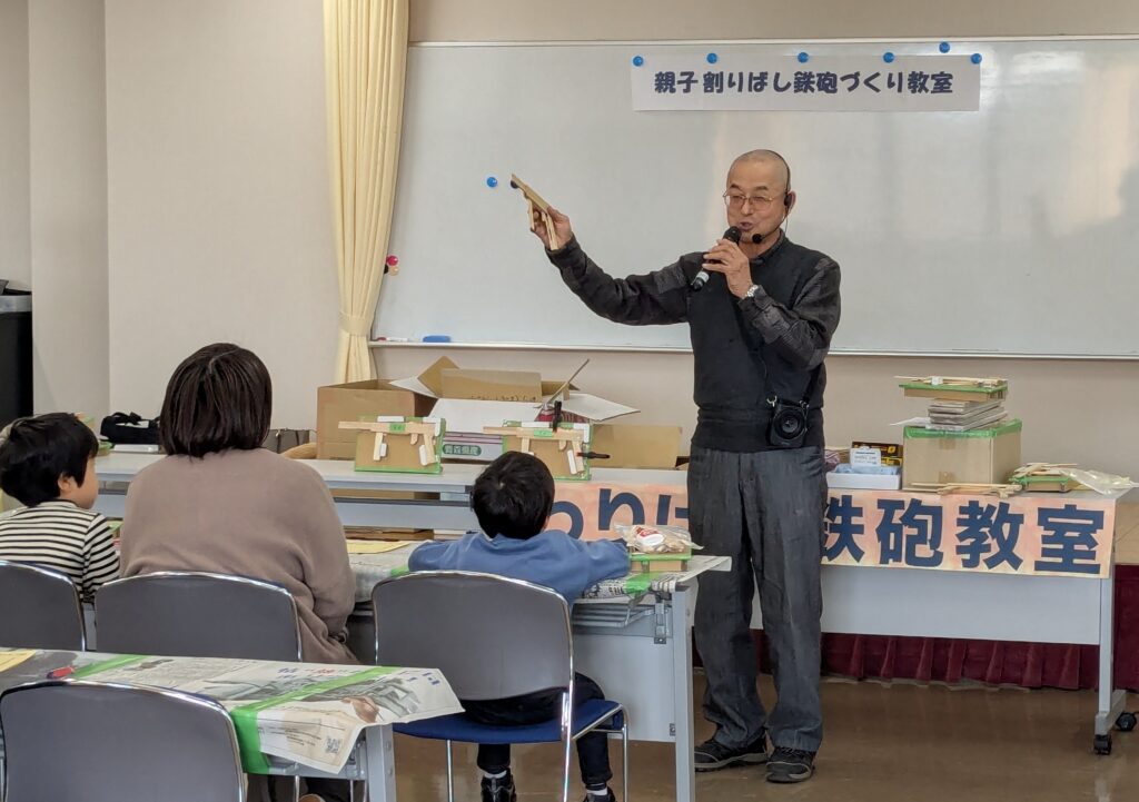 恒例の岩田和之 連区公民館長の挨拶です。「今日の鉄砲のパーツは、全て堀部長の完全手作りです。親子で頑張って取り組んでください。」と言われました。