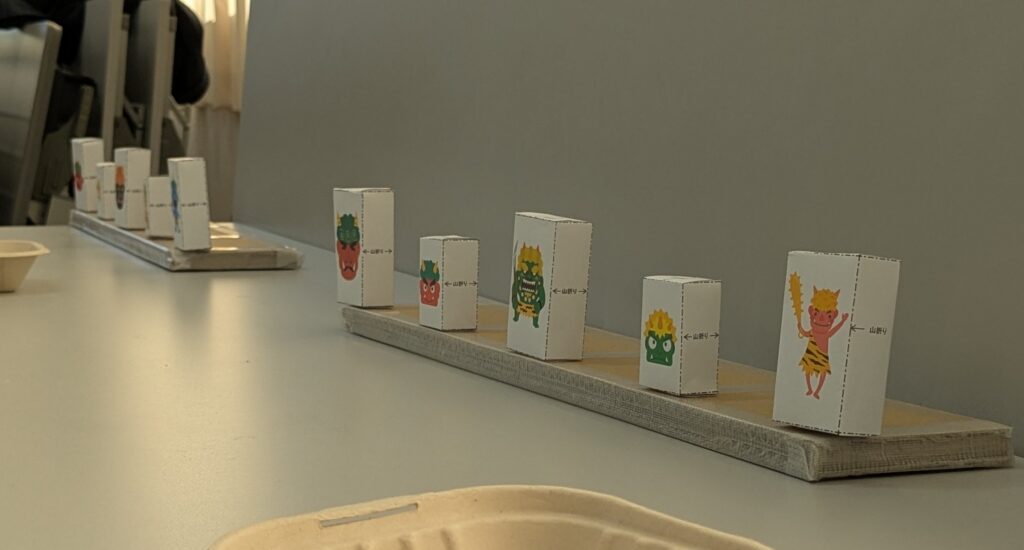 台の上に標的を取り付けます。ここにも工夫があり、クリアファイルを長方形に切り、標的と台に取り付けることにより、ゴムが的に当たった後も元に戻ります。