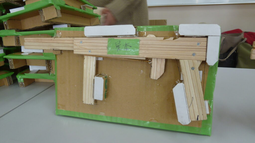 素材は割り箸です。10個のパーツの組み立てとなります。輪ゴムは2つ着装でき、細かい部分まで丁寧にできています。(全て堀部長の手作りです。毎回、ありがとうございます。)