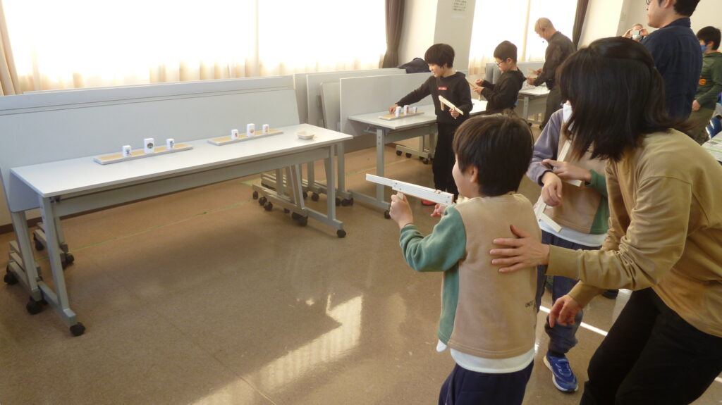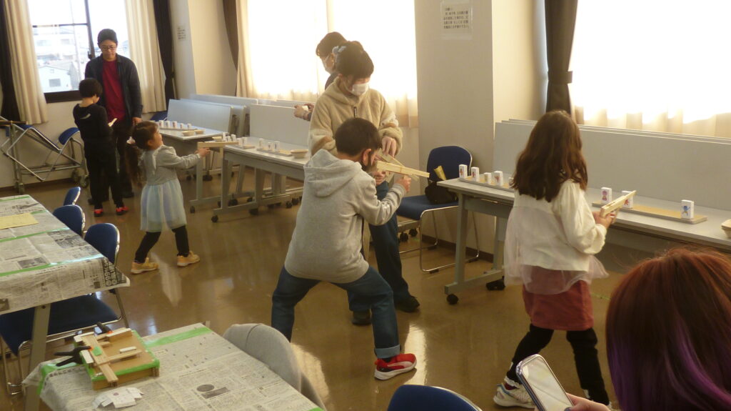 自分の作った的に向かって玉のゴムが当たると、歓声が沸き起こっていました。外は寒いですが、温かい冬のひと時となりました。