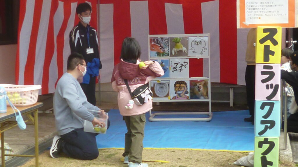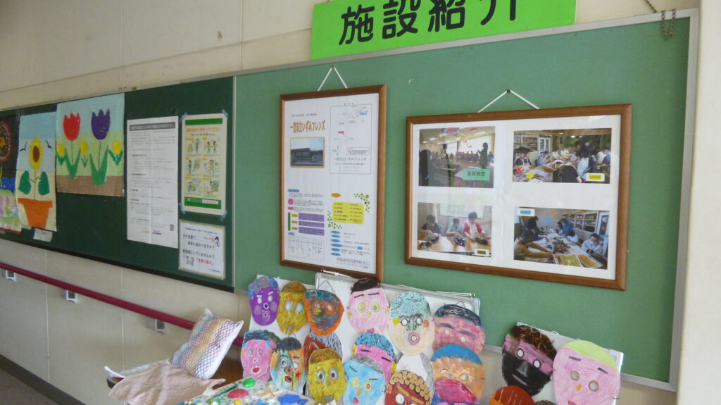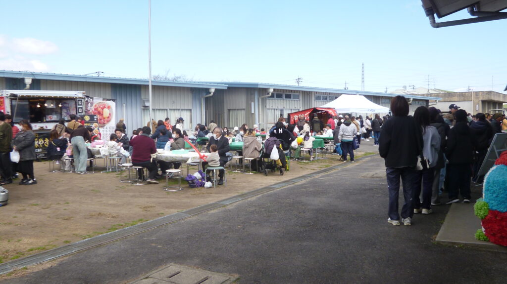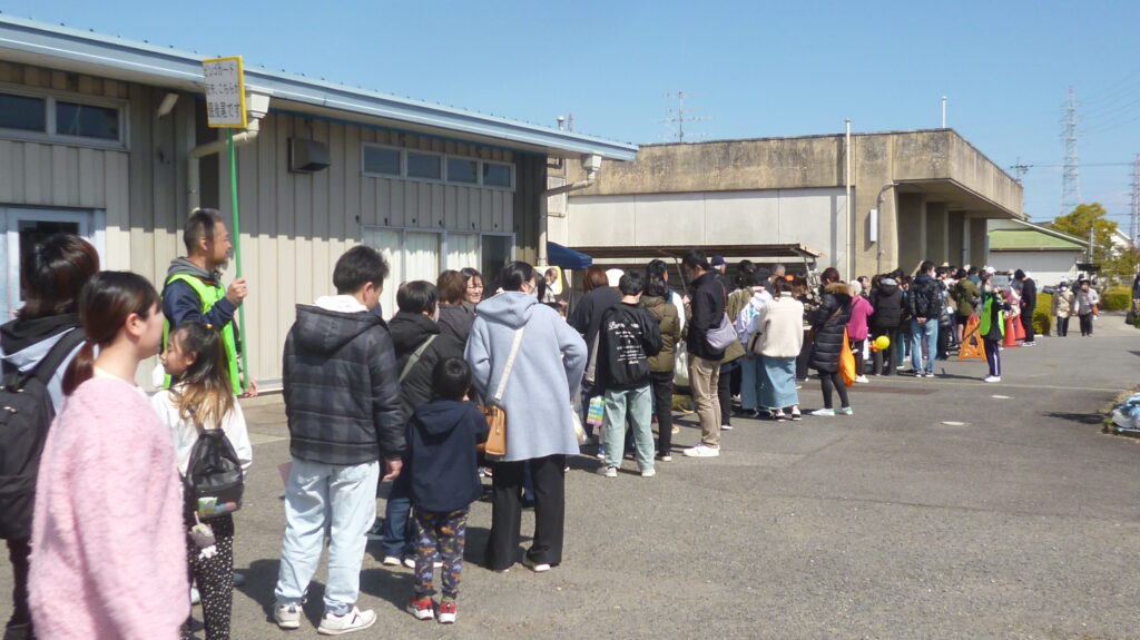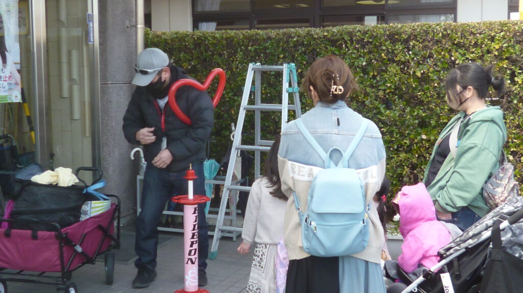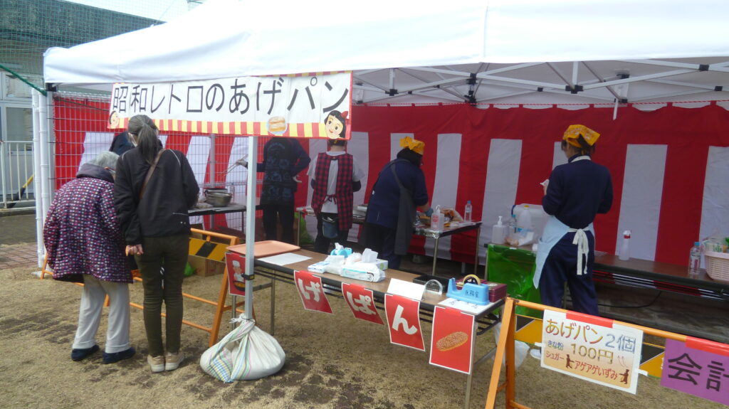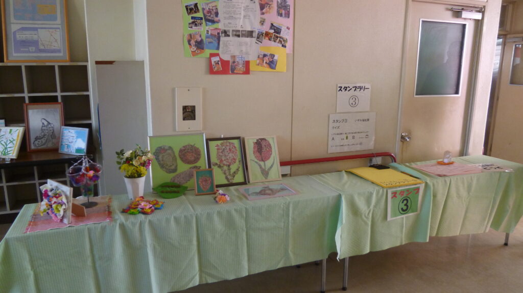 天候に恵まれたものの冷たい北風の吹く中を大勢の方が来場されて、施設紹介や作品展示に足を止めていました。近隣の作業所からの出店や、日用品と食品などの販売があり、他にもスタンプラリーやバルーンアート、色々なゲーム、懐かしい食べ物、軽快なおしゃべりと歌に楽器演奏などもあり、皆さん楽しんでいました。午後から行われるビンゴゲームで使うカードの配布には長蛇の列が出来ていました。