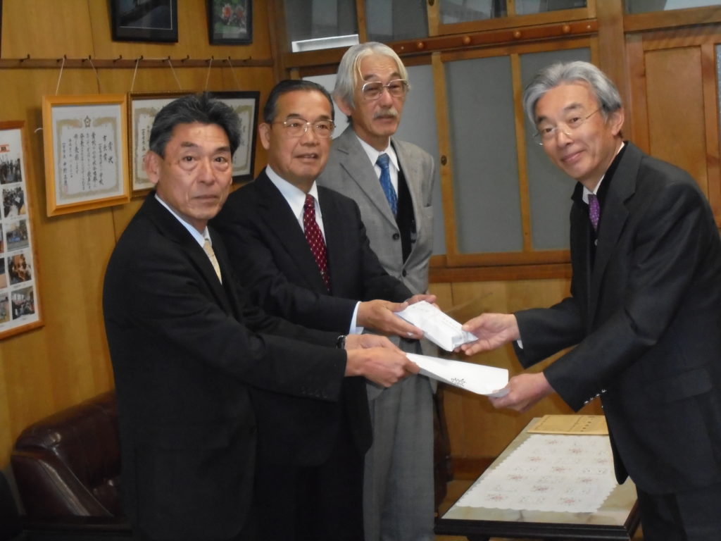 会の代表として森連区長、尾関副連区長、浅野副連区長そして葛谷所長が3小学校を訪れ、それぞれの校長先生に防犯ブザーをお渡ししました。