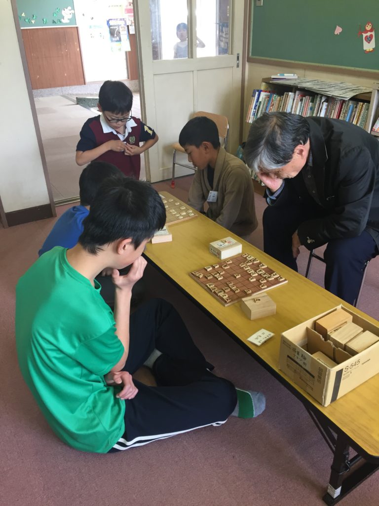 まず挨拶から始まり、どの子も手際よく将棋盤に駒を並べていきます。6年生の子が下級生にわかりやすく、丁寧に教えていました。また、違う将棋盤では、お互い攻め方や守り方を話しながら指し進めていました。