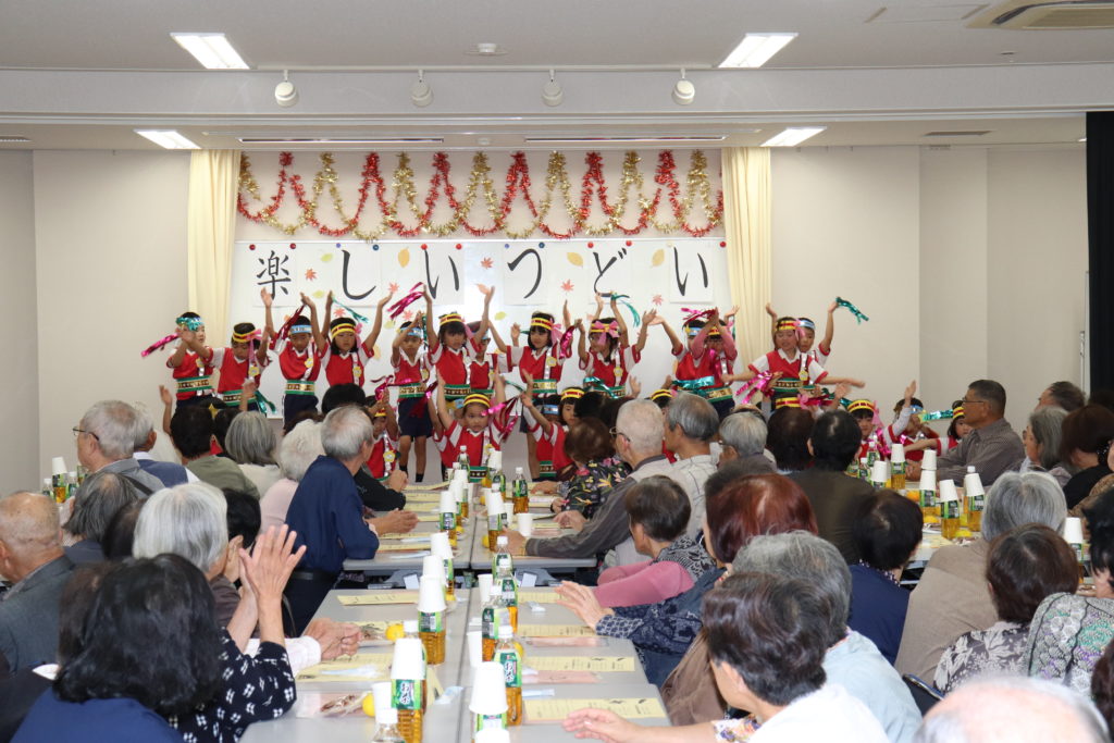 平安幼稚園の園児による歌、遊戯で可愛らしいしぐさに拍手の連続でした。
