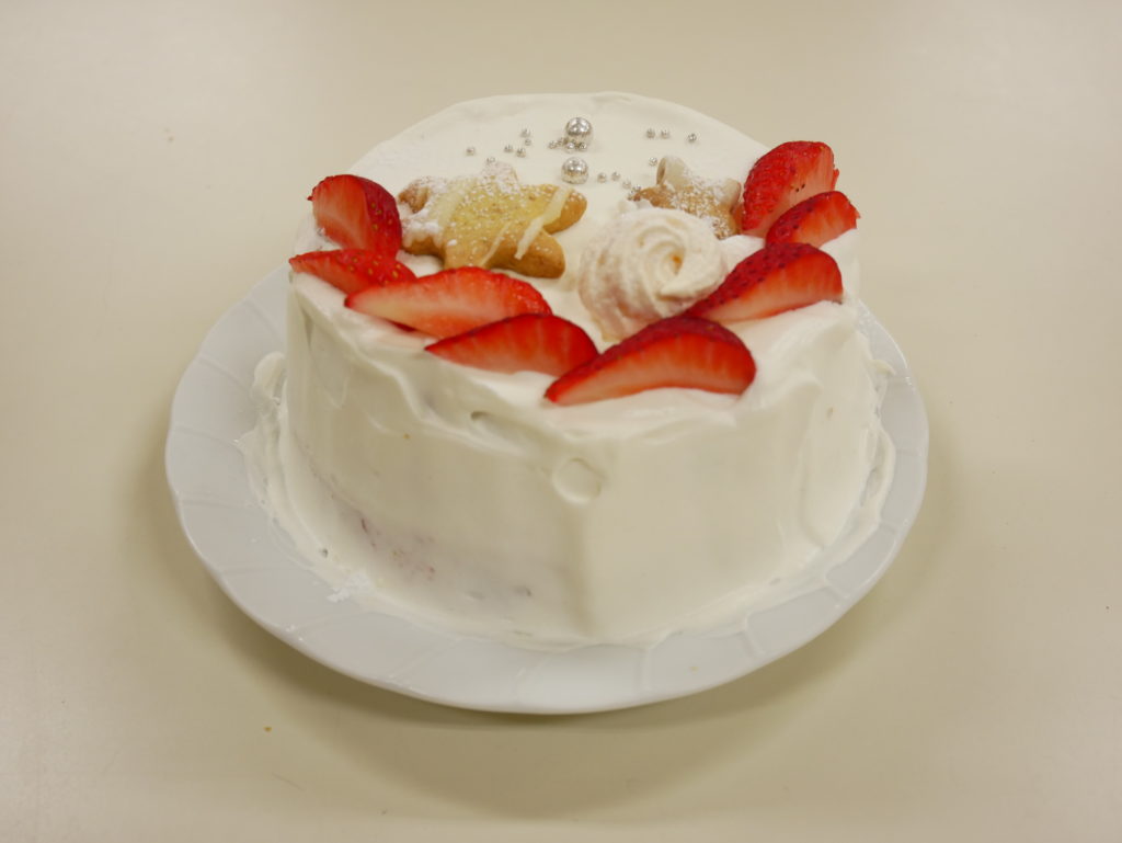 焼き上がって、オーブンからケーキやパンを出すときは歓声があがり、ケーキのデコレーションはみんな時間をかけて仕上げていました。焼き上がったばかりのパンを食べた子どもたちは「美味しい!」「パンがふわふわ!」と言っていました。出来上がったパンは袋に入れラッピングし、ケーキは箱に入れて、立派なパンとホールケーキが完成しました。