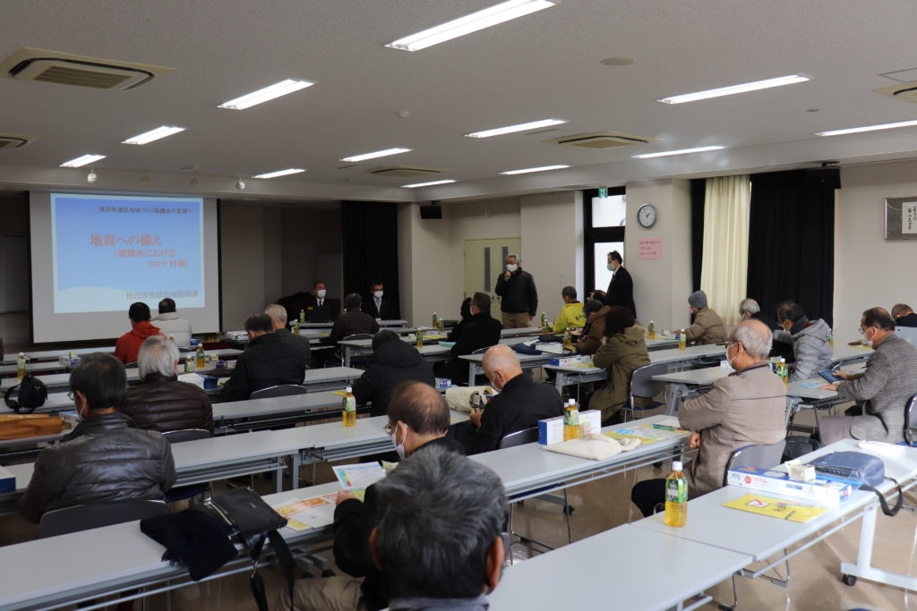 12月16日(水)午後2時より浅井公民館大会議室で地域づくり協議会地域振興部会主催の防災講習会が開催されました。この講習会は例年12月に 開催している「町内防災リーダー養成講座」が新型コロナ感染拡大により 中止となり、その代替講習会として開催されました。市危機管理課の倉見課長、 宮田副主監による出前講座で、今回は「避難所運営におけるコロナ対策」に ついて、浅井町22の町会長さんと、地域づくりの会員30名限定で開催しました。