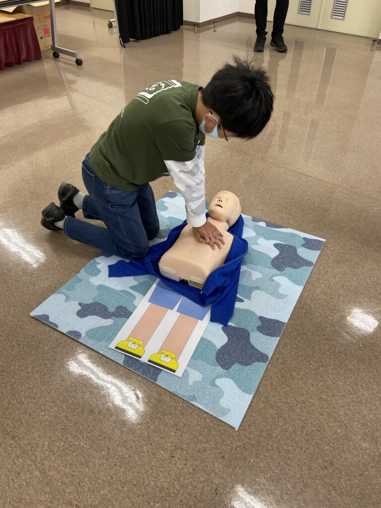 第1部は、消防士や看護師でチームを作っている「チームプッシュハート」のメンバーの方3人に来てもらい、AEDや人形を使って心肺蘇生法を学びました。丁寧で分かりやすい説明ということもあり、参加者は手順に迷うこともなく、真剣に蘇生方法に取り組んでいました。