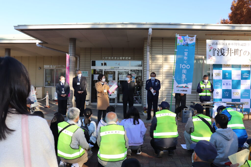 12月5日(日)午前9時より、一宮市市政施行100周年記念事業の一環として浅井町地域づくり協議会主催の「浅井町の桜を守ろう」イベントが大野極楽寺公園にて開催されました。この事業は一宮市が市制 100周年を迎えるにあたり、浅井町地域づくり協議会の主催で、木曽川堤にある国の名勝・天然記念物である桜並木に名札を付ける内容で、浅井町内の小中学生38名と地域づくり役員35名が協力して、町内にある桜320本に、小中学生が手作りした銘板を取り付けました。
