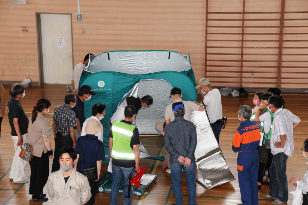 その後、2つのグループに分かれて行う「ワンタッチパーティションの設営訓練」と「段ボール簡易ベッドの設営訓練」では、実際にみんなで作りました。そして、完成したパーティションに入ったり簡易ベッドに横になって寝心地を体験しました。参加者からは避難所では、手分けして作業したり、みんなで協力し合うことがやはり大切で、それが早く円滑な避難所運営につながるという声がありました。