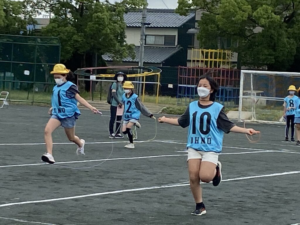 感染予防はもちろんのこと、この時期は、熱中症対策にも気をつけながら、子どもたちは、競技の縄跳びと、靴飛ばしに挑戦しました。低学年でも縄跳びがとても上手な子も多く、また、普段は思いっきり出来ない靴飛ばしを楽しんでました。競技を終えた子どもたちはくじを引いて、参加賞のお菓子をもらいました。