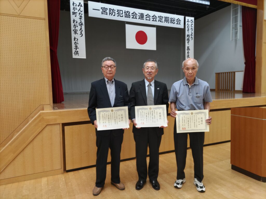 6月19日(月)尾西生涯学習センターで一宮防犯活動連合定期総会が開催されました。席上防犯活動に貢献した方に感謝状の贈呈が行われ、浅井町からは12年間子ども見守りををされた、黒岩の伊貝守男さんと振り込み詐欺を事前に防いだ東尾関の細川孝夫さん、それに浅井防犯パトロール隊に感謝状が贈呈されました。
