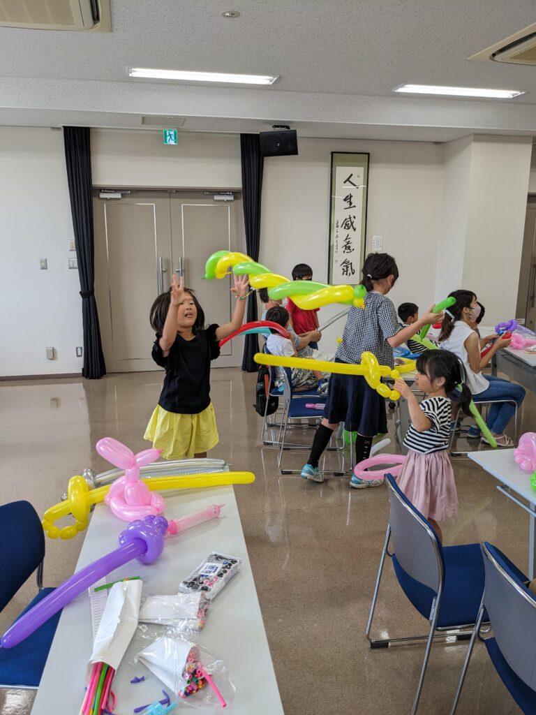 6月24日(日)浅井公民館において『親子バルーンアート教室』(主催:浅井公民館家庭学習部)が開催されました。この日は、1歳から11歳までの子どもとその保護者、計13組37名が参加しました。みなさん楽しそうに風船を膨らませて、思い思いの作品を作っていました。中には膨らませすぎてしまい、あちらこちらで風船が割れる音が響き、そのたびに会場内にはキャーキャーとかわいい声が響いていました。それでも、『剣』『スパイラルアロー』『ウサギ』などの作品を作りあげて持ち帰ることができました。最後に公民館長の川原さんからは「公民館ではこれからも『お楽しみ映画会』や『親子おり紙教室』などの楽しい行事を開催するので、またみんなで遊びにきてください」と挨拶がありました。