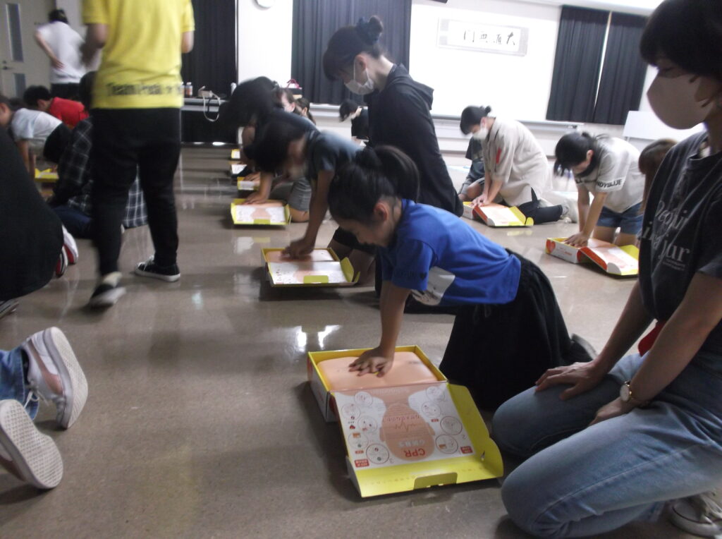 救命救急講習では、機械などを使い、胸部圧迫法(CPR)とAEDを習いました。子どもでも大人でも、救える命があることや、素早い救護で生存率が上がることなどを学びました。
