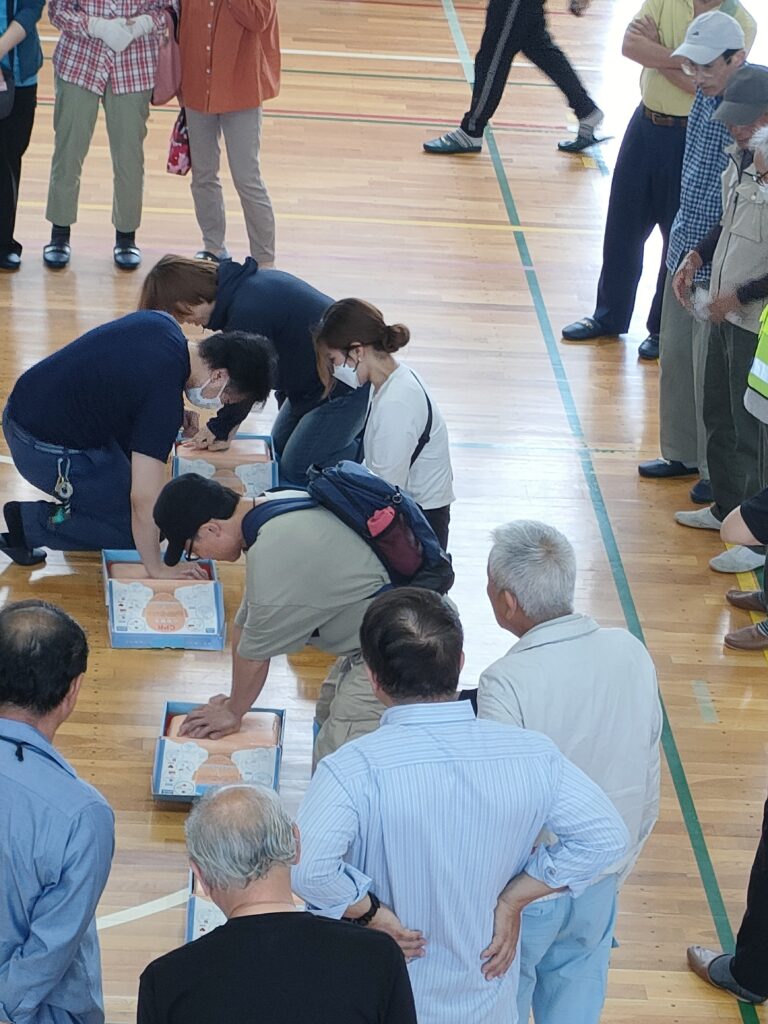 初めに危機管理課より避難所設営の講話があり、その後2班に分かれて①簡易トイレ・パーティションテント設営訓練 ②救急救命訓練で心肺蘇生(AEDの操作)を体験しました。その後、防災備蓄倉庫見学を行い備蓄品の確認をしました。