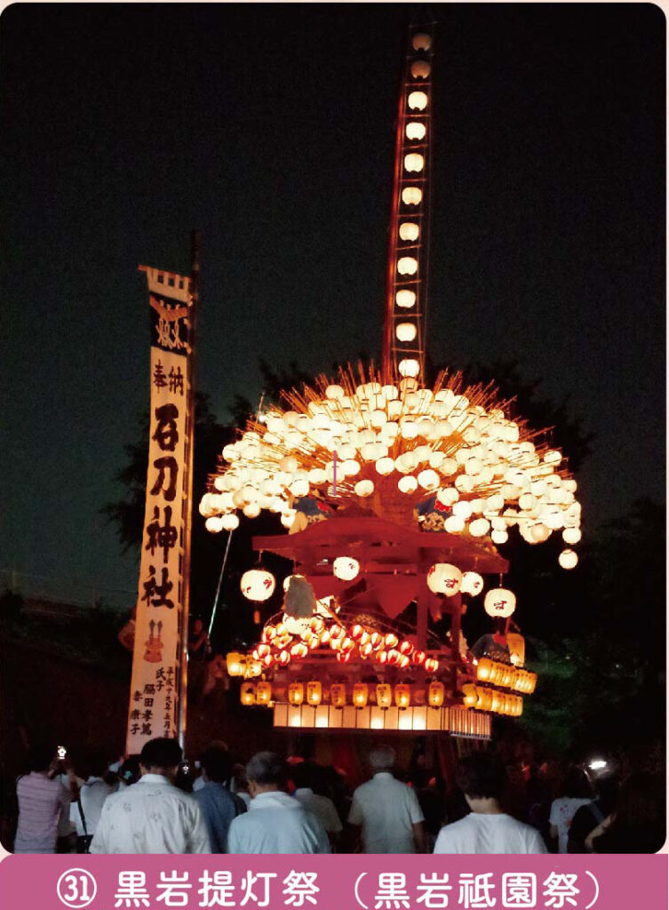 石刀神社の祭りで、二層の山車に月・日にちなんで大小の提灯をかざり囃子とともに練り歩く。旧暦6月15日の夜に行われる。明治初年までは川舟形式で、古くからの黒岩祇園祭と言われていた。