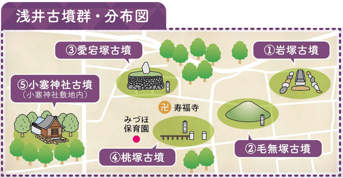 かつてこの地区には数十基の古墳があったが、現在浅井町では「浅井古墳群」として県文化財に史跡指定を受けた5基を見学することが出来る。